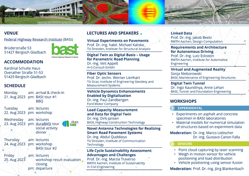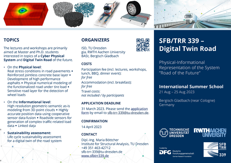 We are inviting to the International Summer School of our SFB/TRR 339. The event will take place at the Federal Highway Research Institute (BASt) in Bergisch Gladbach (near Cologne). It is our goal to bring together talented international Master and Ph.D. students. With selected speakers from academia and industry we want to provide to you a comprehensive overview of the state-of-the-art research in the field, while giving the opportunity for discussions and applying the knowledge in hands-on workshops. The focus will be on the following topics: